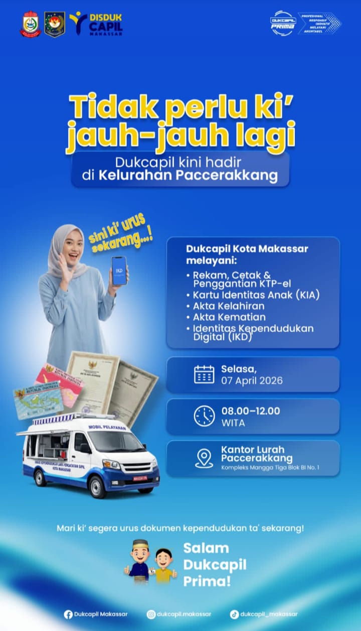 Kegiatan pelayanan administrasi kependudukan tersebut dijadwalkan berlangsung pada Selasa, 7 April 2026, mulai pukul 08.00 hingga 12.00 WITA, bertempat di Kantor Lurah Paccerakkang, Kompleks Mangga Tiga Blok B1 No.1.