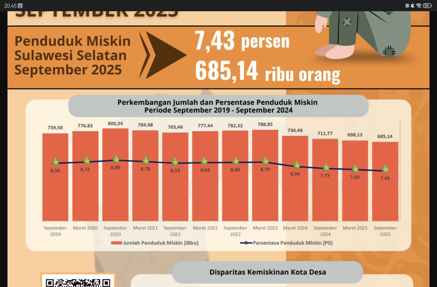 Berdasarkan data BPS Sulsel, persentase penduduk miskin Sulawesi Selatan pada September 2025 tercatat sebesar 7,43 persen atau setara dengan 685,14 ribu jiwa. Angka ini menjadi yang terendah sejak Pandemi Covid-2019, sekaligus menegaskan keberlanjutan tren perbaikan kondisi sosial ekonomi masyarakat Sulsel.