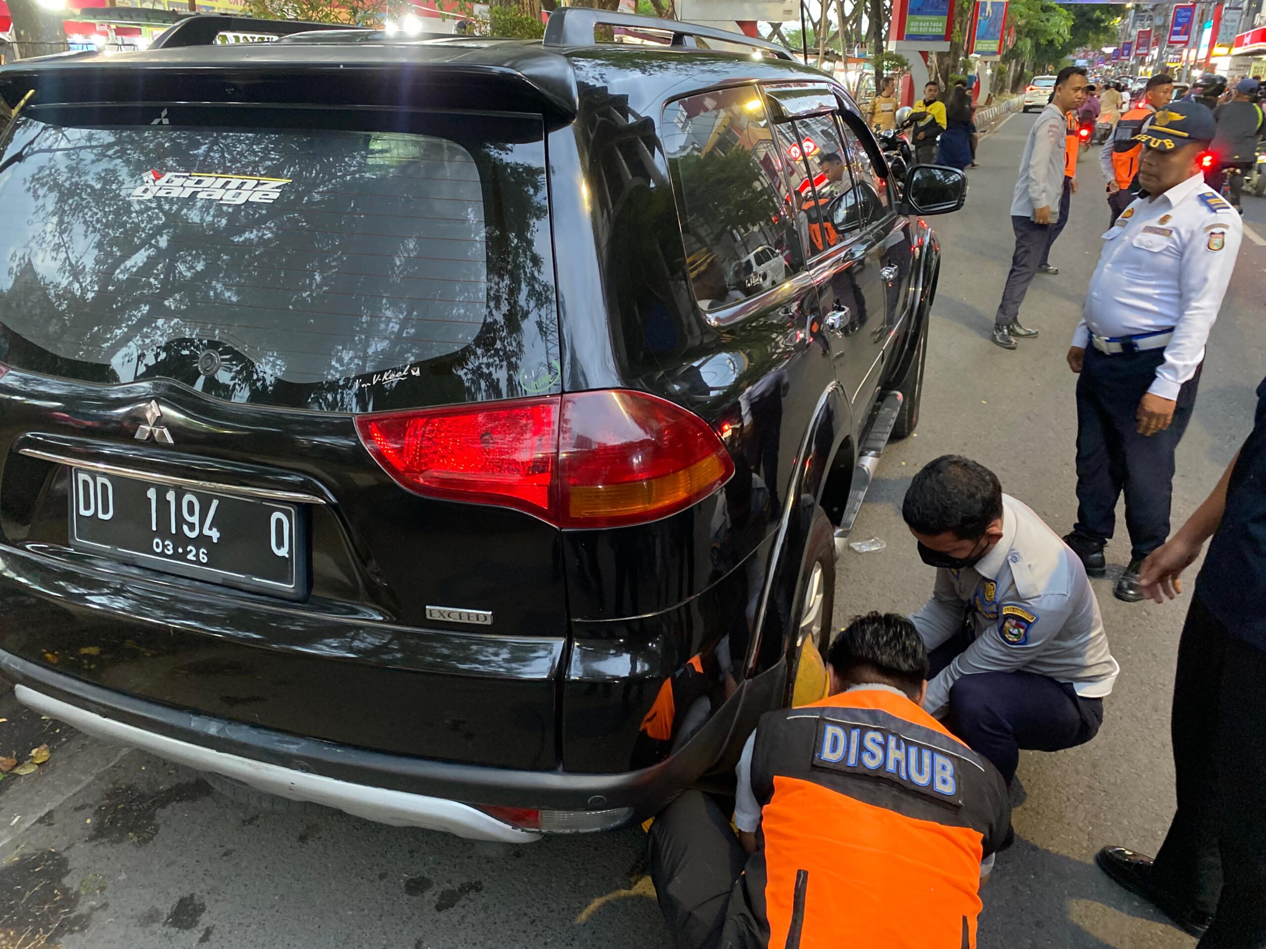 Kegiatan razia kendaraan melakukan parkir liar dilakukan bersama pihak Kepolisian di beberapa tempat dikota Makassar seperti di kawasan Jalan Boulevard, Kecamatan Panakkukang, didepan Mall Ratu Indah jalan Ratulangi serta di sepanjang jalan penghibur Minggu (14/9/2025).