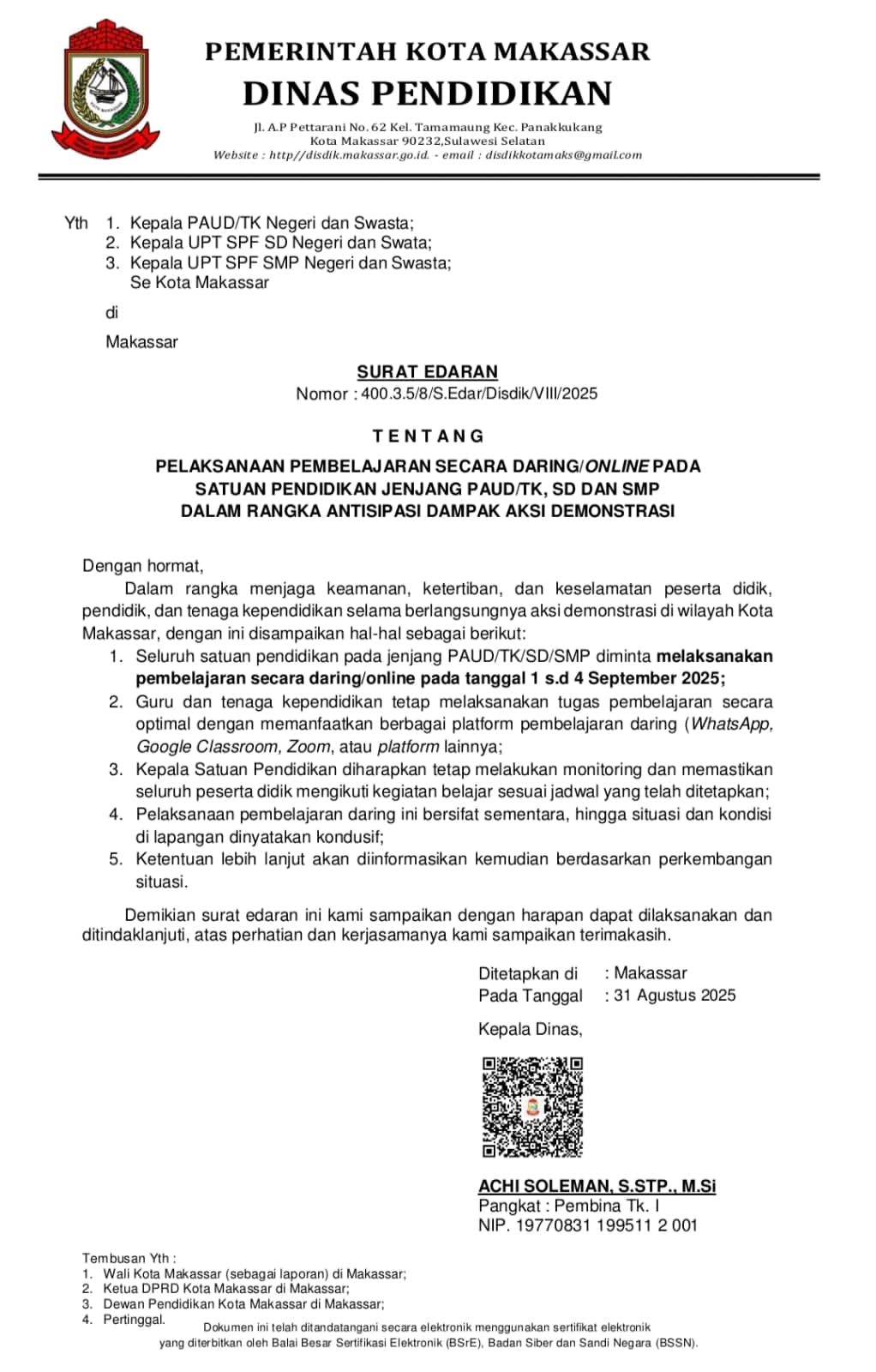 Tak hanya bagi pegawai, Dinas Pendidikan (Disdik) Kota Makassar menginstruksikan seluruh satuan pendidikan jenjang PAUD/TK, SD, dan SMP, baik negeri maupun swasta, untuk melaksanakan pembelajaran secara daring pada 1–4 September 2025.