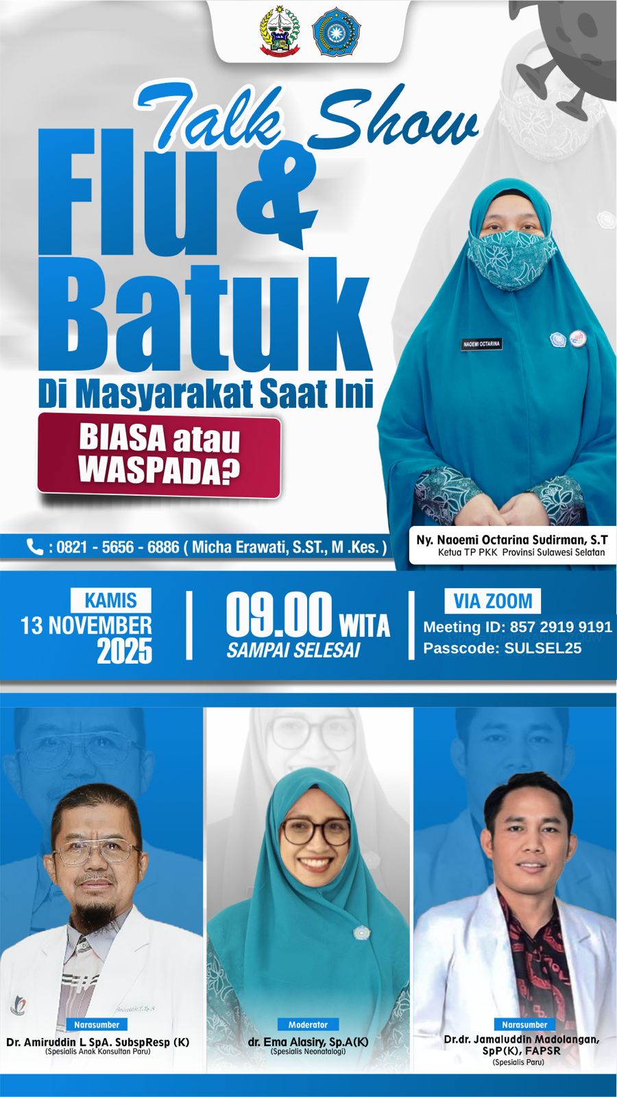 Talk show ini menghadirkan dua narasumber ahli di bidangnya. Yakni dr. Amirudin L, Sp.A, SubSpResp(K) dengan materi “Kenali Gejala Pneumonia pada Anak dan Pencegahannya”, serta Dr. dr. Jamaluddin Madalangan, Sp.P(K), FAPSR dengan materi “Flu dan Batuk di Masyarakat Saat Ini: Influenza? COVID? atau ISPA? Bagaimana Mencegahnya?”