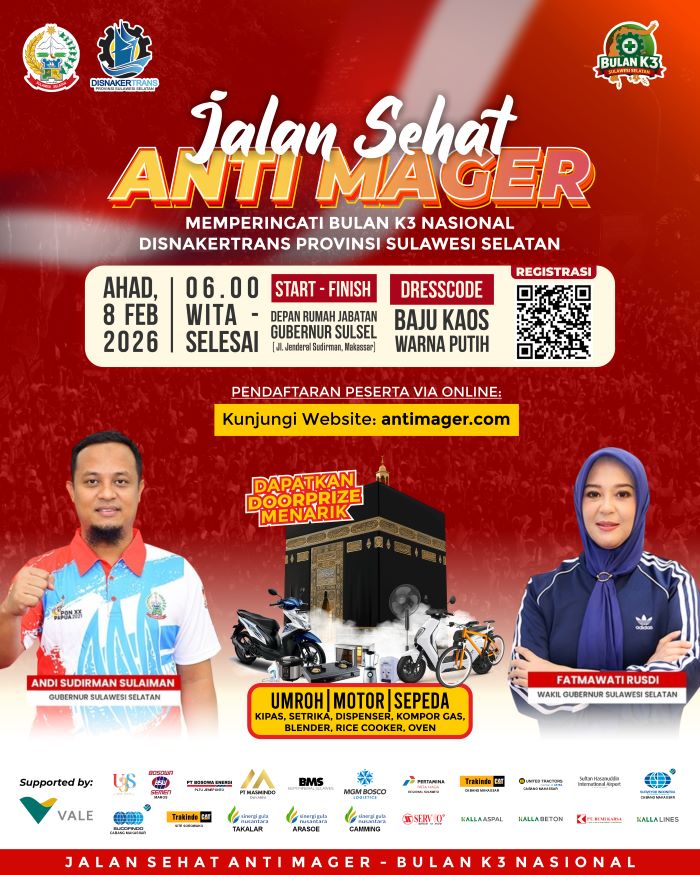 Makassar, zona redaksi.id— Pemerintah Provinsi Sulawesi Selatan melalui Dinas Ketenagakerjaan dan Transmigrasi (Disnakertrans) Provinsi Sulsel akan menggelar kegiatan Jalan Sehat Anti Mager dalam rangka memperingati Bulan Keselamatan dan Kesehatan Kerja (K3) Nasional 2026, pada Minggu, 8 Februari 2026.