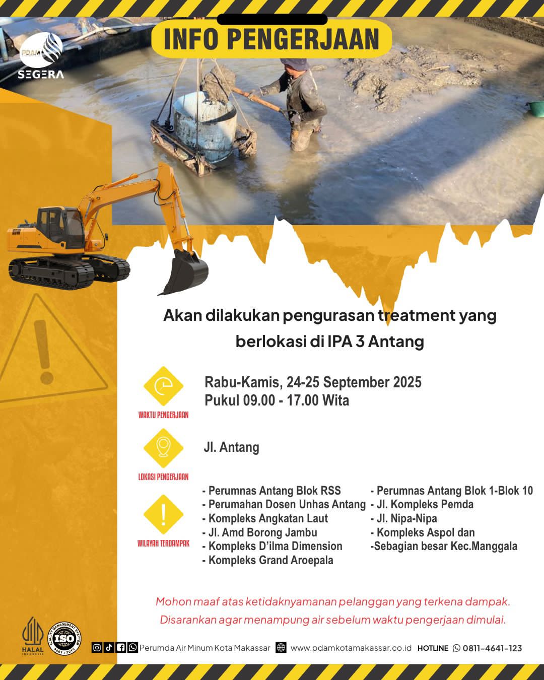 Makassar,zona redaksi.id — Perumda Air Minum Kota Makassar akan melakukan pengurasan treatment di Instalasi Pengolahan Air (IPA) 3 Antang pada Rabu-Kamis, 24–25 September 2025, mulai pukul 09.00 hingga 17.00 WITA. Pengerjaan ini diperkirakan berdampak pada suplai air bersih di sejumlah kawasan.