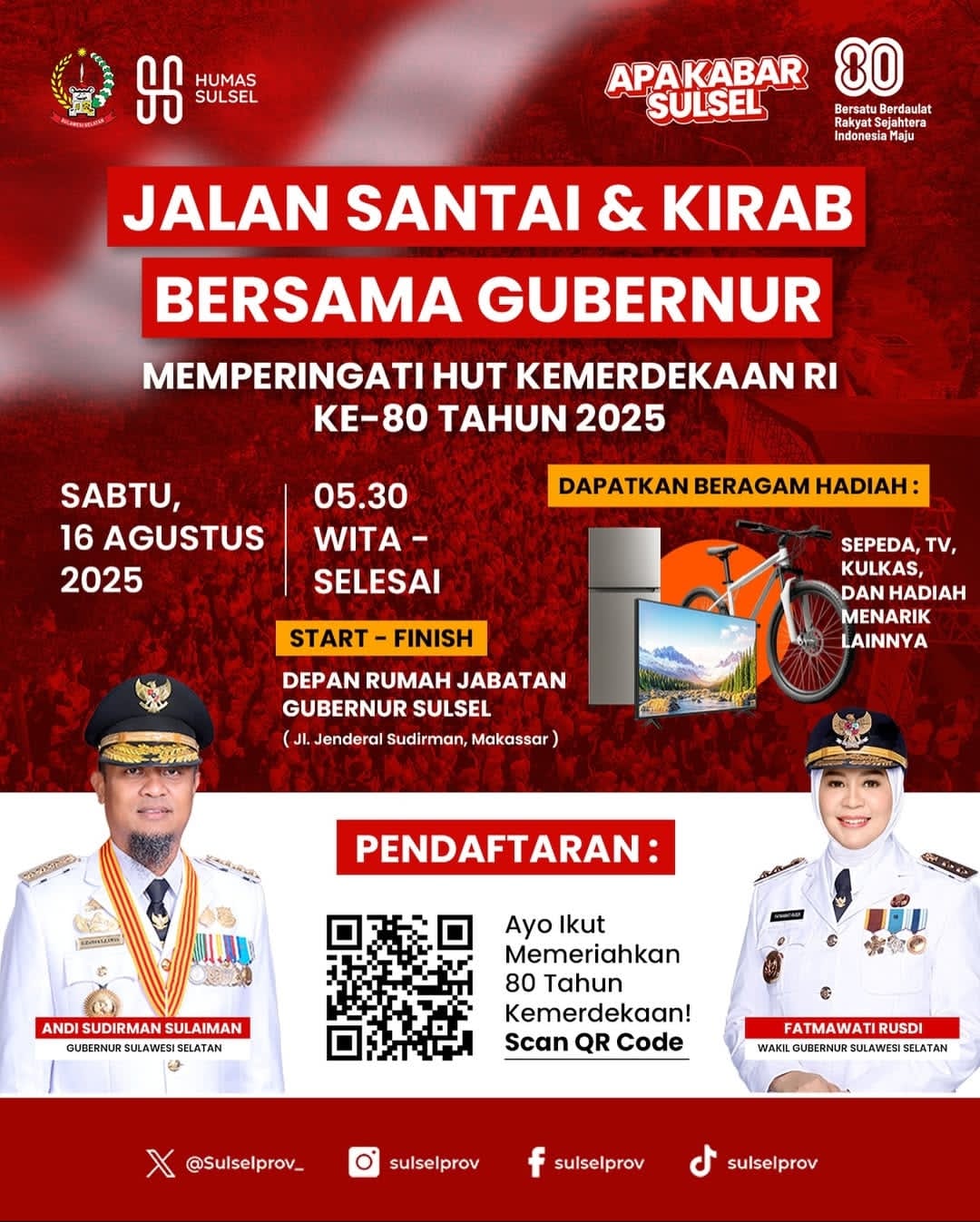 Makassar, zona redaksi.id— Dalam rangka memperingati Hari Ulang Tahun Kemerdekaan Republik Indonesia ke-80, Pemerintah Provinsi Sulawesi Selatan menggelar kegiatan “Jalan Santai dan Kirab Bersama Gubernur” yang akan berlangsung pada Sabtu, 16 Agustus 2025 pukul 05.30 WITA.
