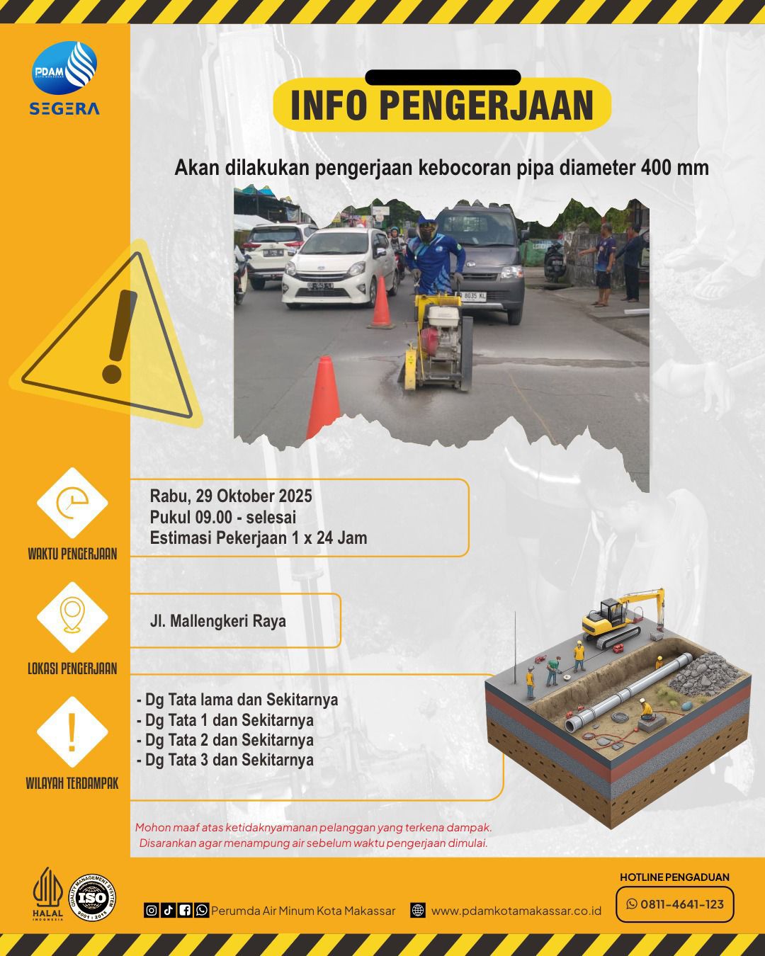 Diketahui, Perumda Air Minum Kota Makassar telah mengumumkan rencana pengerjaan kebocoran pipa berdiameter 400 mm di Jalan Mallengkeri Raya melalui akun resmi Instagram @perumdairminum.kotamakassar sebelum pengerjaan dilakukan.